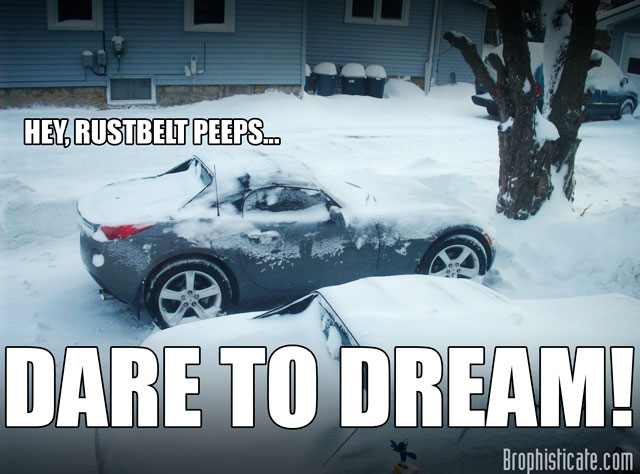 We at the Brophisticate would like to wish you a warm, shortest day of the year. And, nothing says “happy winter solstice” like an American-made, rear-wheel drive convertible in snow. If you’re driving this in the rustbelt, what would be the shortest day of the year would quickly turn into the longest night of your life. Want proof? Here’s a video below. Only wish he’d have hit the garage door at the end. Lol