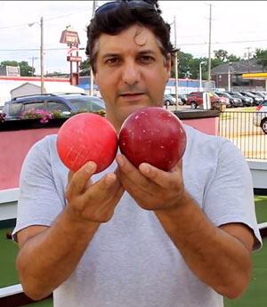 Chuck Cinelli holds a store-bought bocce ball (left) vs. the kind used to play the sport at his Italian market (right).