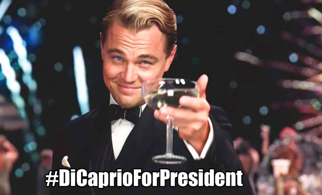 We propose #DiCaprioForPresident! If he can fight a grizzly bear in The Revenant, then he could handily take on The Trump. He’s made no secret about his political leanings, and actively combats global warming among other green causes. Why the hell not, right?